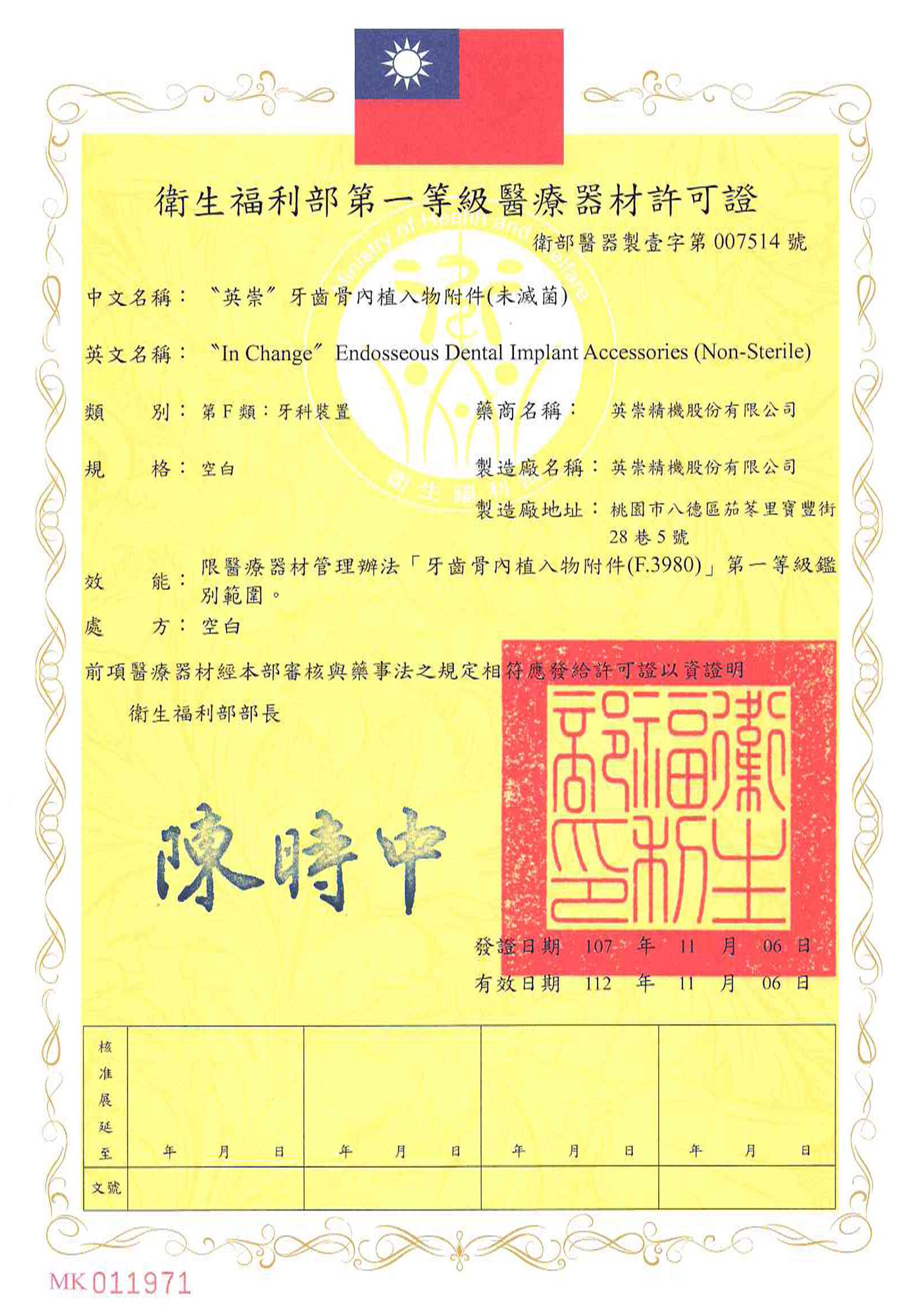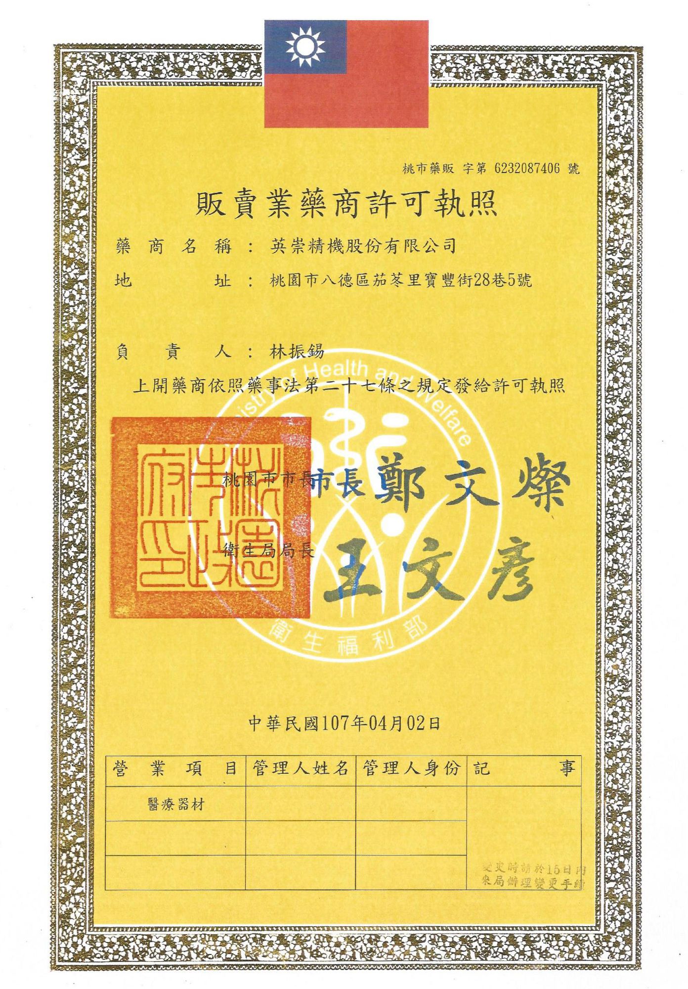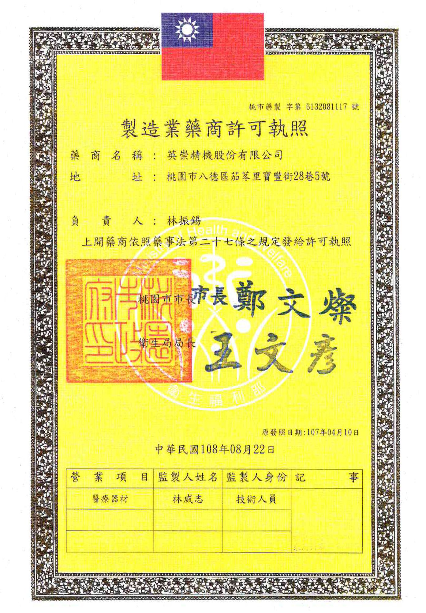 本公司目前擁有販賣以及製造藥商許可證,並且擁有獨家牙科器械的代工權,逐漸跨入醫療器材製造公司的行列。 英崇通過ISO 9001、ISO 13485以及GMP的認證,落實 ISO 品質核心政策是我們的信念, 提供穩定可靠的產品解決方案是英崇對客戶的承諾。 ISO9001認證 ISO13485認證 販賣藥商許可證 藥商許可證 醫療器材許可證
